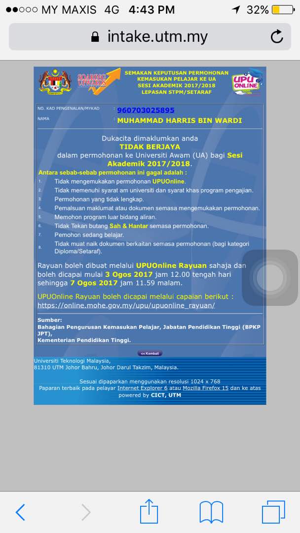 Hanya pemohon yang gagal mendapat tawaran serta yang ditawarkan ke program. #intakeuitm jika ada kemusykilan mengenai upu, refer direct @twt_upu dan web upu bagi permohonan uitm uitm seri iskandar • infopelajar2u @uitm_si · 16 мая 2017 г. You can choose the semakan upu online 2017 + rayuan apk version that suits your phone, tablet, tv. Kalendar penting permohonan, pembelian pin upu, keputusan dan rayuan. Rayuan upu lepasan stpm online.